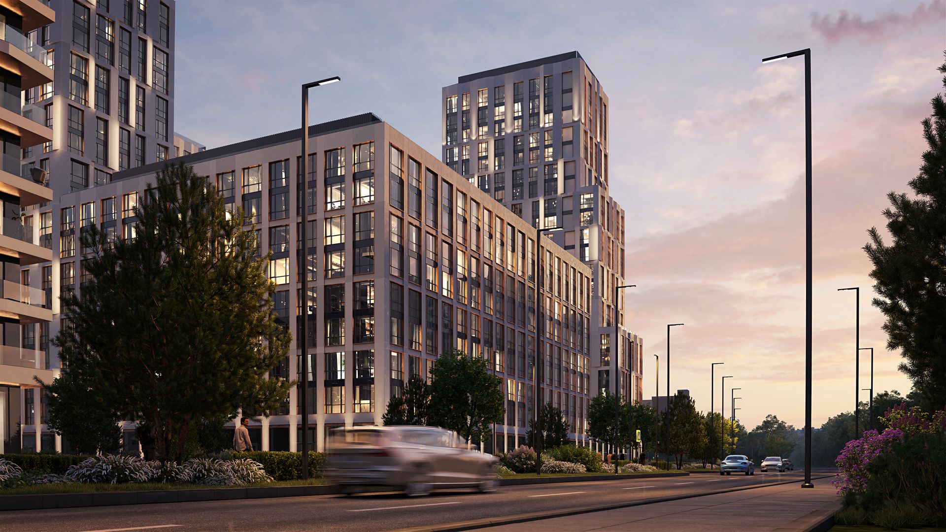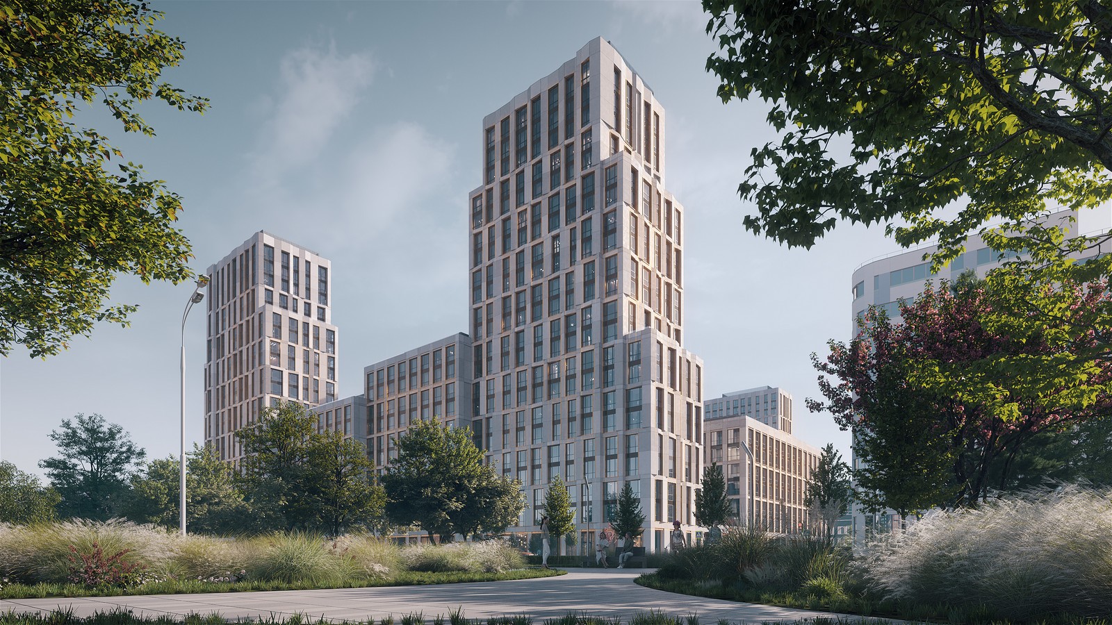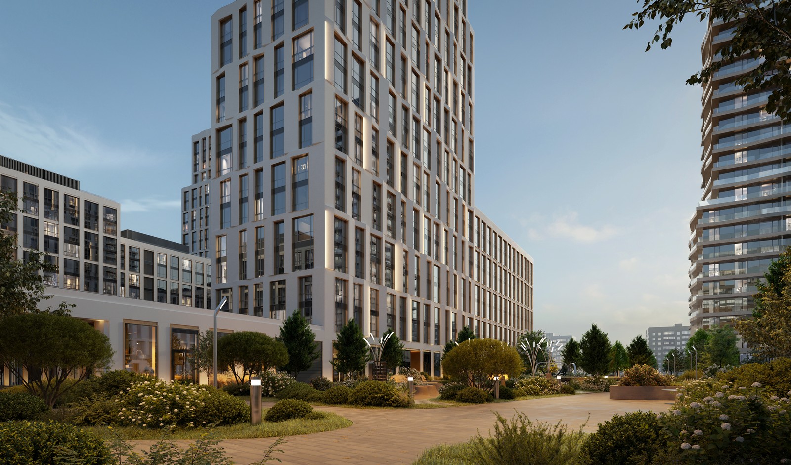 Бело-сиреневая гамма цветущих растений выбрана для озеленения жилого квартала PRIDE