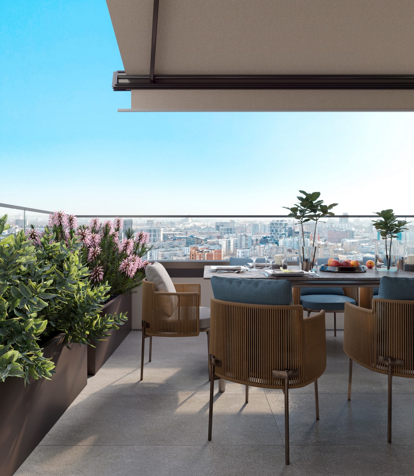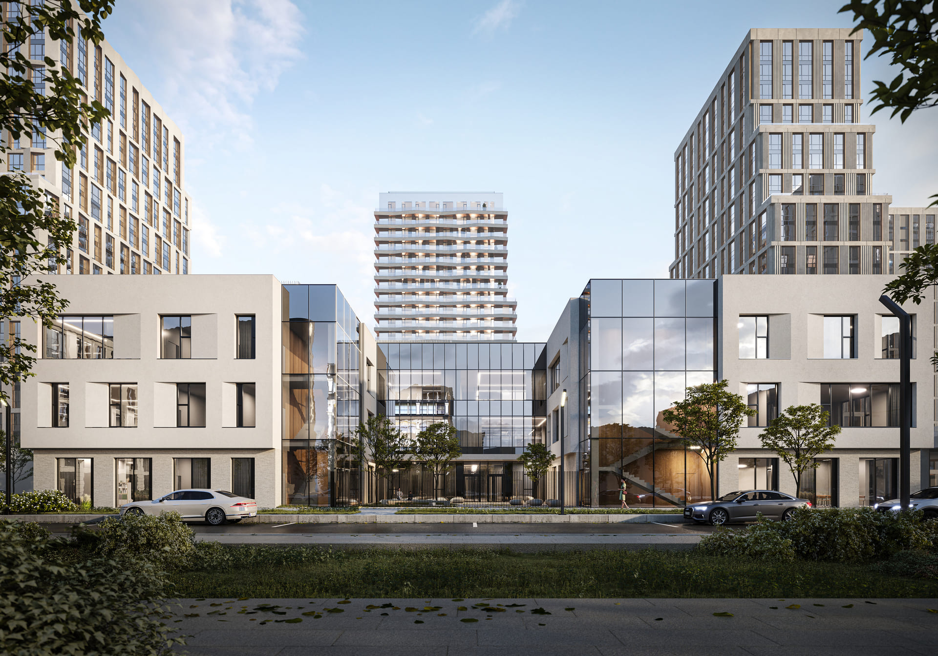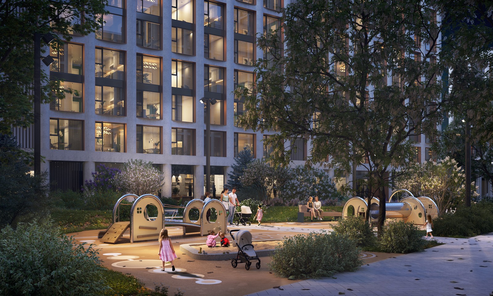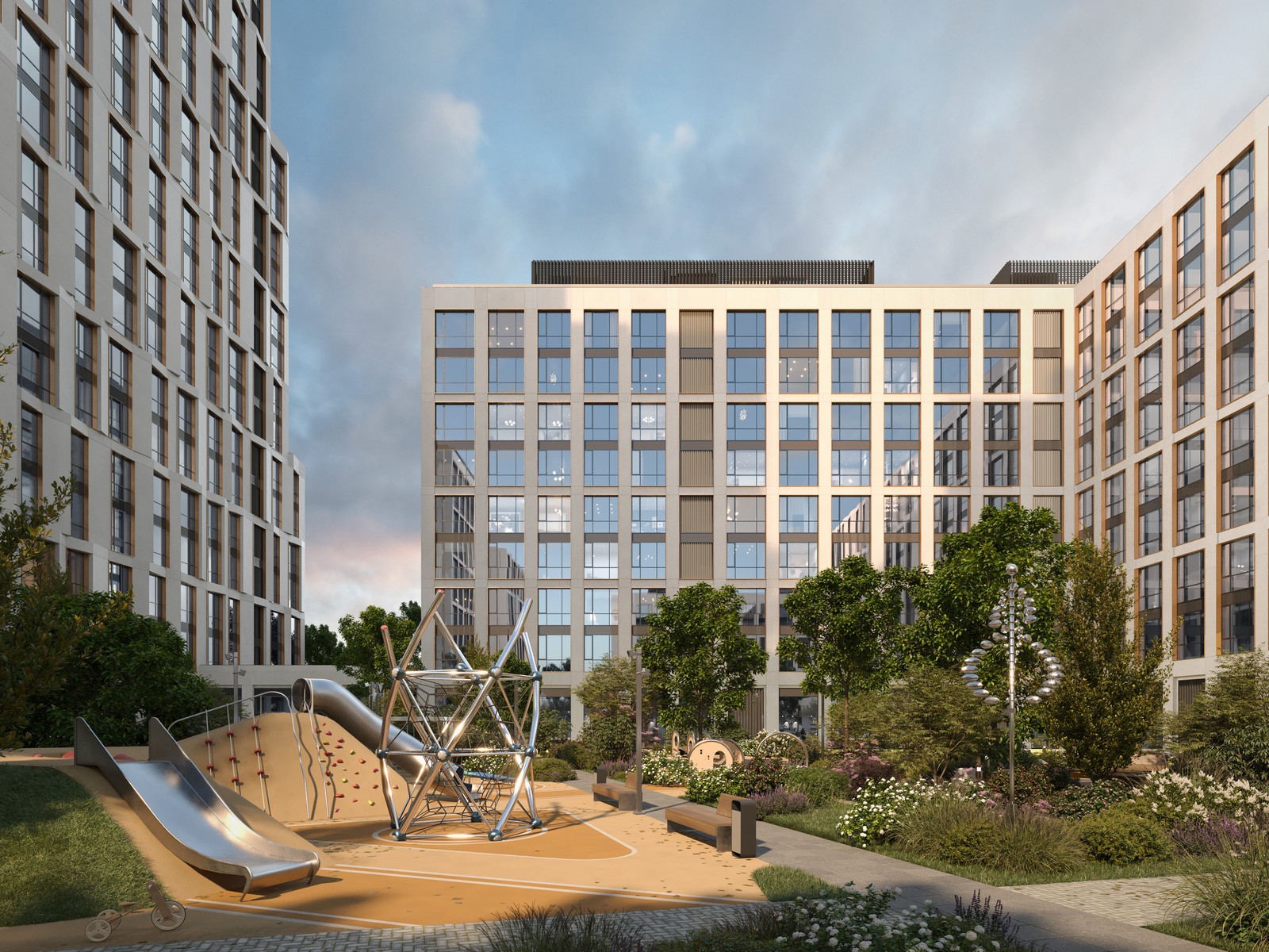Бело-сиреневая гамма цветущих растений выбрана для озеленения жилого квартала PRIDE